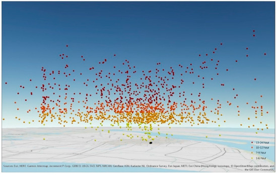 In Figure 6, a time series of snapshots shows the evolution of Weibo messages. A 3D spatial–temporal dot map in Figure 7 provides an alternative view of the distribution of event-related Weibo records in the first 24 h. The black spot indicates the location of the stampede event. As can be seen from these two figures, a few Weibo data were posted near the event location in the first few hours, and the distribution became slowly dispersed. Seven hours later, people started to wake up and Weibo data grew rapidly and spread out. Twelve hours later, the news spread to almost the entire Shanghai city, causing the continued spread of the information over the whole area. Comparing the distributions from one week later to three months later, we find almost no further change.
