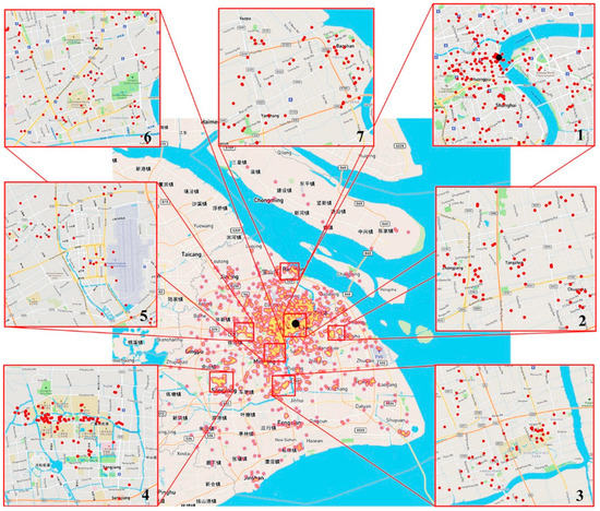 We used the torque-aggregation-function (torque-resolution = 2) provided by CartoDB to aggregate the geo-location of the event-related Weibo data [58]. The aggregation result is visualized as a heatmap in Figure 8. We can see clearly some hotspots (i.e., yellow areas) distributed in different areas of the city. Then, we used the density-based spatial clustering of applications with noise (DBSCAN) algorithm to select the most clustered areas. Based on the knowledge about the size of the Shanghai area and the number of event-related data, we tried with several different parameters and used one percent of the total number of event-related data (i.e., 24) as the minimum features per cluster and 1 km as the search distance. The subareas of the seven largest clusters are obtained and enlarged in Figure 8. Subarea 1 has the highest concentration of data and contains a black spot indicating the location of the stampede event. Subareas 2 and 7 are residential areas, and subarea 5 contains the Shanghai Hongqiao International Airport. The remaining three subareas are campus regions of universities and student dormitories. Students and intellectual groups tended to be more concerned about the event than other citizens.
