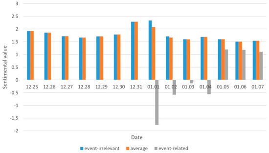 Figure 9 illustrates the results of our statistical analysis on the daily average sentimental changes in different datasets around the week before and after the incident. Blue bars represent the daily average sentimental value of the event-irrelevant information, red bars indicate the daily average sentimental value of all Weibo messages, and gray bars indicate the daily average sentimental value of the event-related information. Some fluctuation of the daily average sentiment in all Weibo data can be perceived. The daily average sentimental value declined gradually from 25 December and went up after 28 December. It peaked on 31 December but dropped back in the following days. A plausible reason for this change is that 25 December is Christmas day, so the public mood is slightly lighter. By the last day of the year, the public’s mood peaks due to the coming new year. As can be seen, the Shanghai public’s sentiment is very positive in daily life.