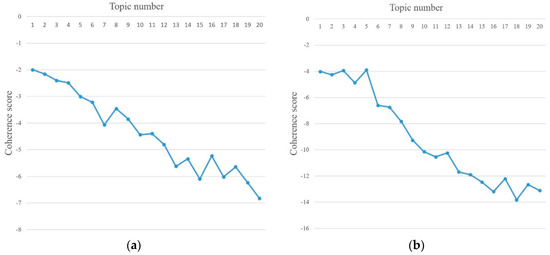 - Newman, D.; Lau, J.H.; Grieser, K.; Baldwin, T. Automatic evaluation of topic coherence. In Proceedings of the Human Language Technologies: The 2010 Annual Conference of the North American Chapter of the Association for Computational Linguistics, Los Angeles, CA, USA, 1–6 June 2010; ACL: Stroudsburg, PA, USA, 2010; pp. 100–108. [Google Scholar]