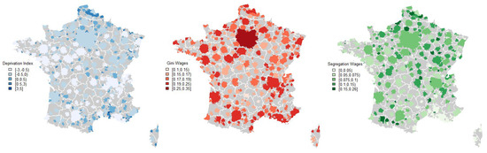 Wage inequality at the level of the city was computed similarly to Cottineau et al. [27]. The inequality index is computed using the Gini index method [28] on groups of similar wage earners as described in the CLAP database holding information on French firms and establishments. The inequality index measures the overall dispersion in the distribution of wages at the city level, and varies between 0 (extreme equality) and 1 (extreme concentration of wages).