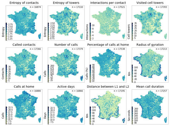 Maps of several mobile phone indicators at cell tower level. Indicators are computed for September 2007, for all users in the French CDR dataset. Users are aggregated at cell tower level by the the Distinct Days Algorithm. Each dot on the map is a cell tower and displays the average indicator value of all users allocated to this cell tower. Cell towers with an average value that is higher, or lower, than 3 standard deviations from the nationwide average are omitted, hence the differing number of displayed cell towers (n) between maps.