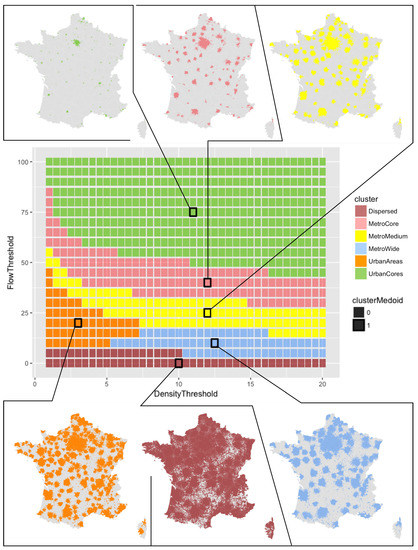 The most numerous definition (“Urban cores” in green on Figure 3) represents ways of defining cities which result in very small aggregates. These “urban cores” are obtained either by highly dense communes with little periphery (right of Figure 3, i.e., high density threshold and middle flow threshold) or a wider centre with no periphery (top left, i.e., middle density threshold and high flow threshold), similarly to Unités Urbaines as defined by the French statistical office INSEE. This is the most restrictive way of thinking about cities and the centroid for this class is obtained with a density minimum of 11 persons per ha and a minimum of 75% of commuters from peripheral communes working in the centre. The next three classes (going clockwise on Figure 3) stretch through similar values of density minima but have increasing peripheries (by lowering the percentage needed to attached communes to the metropolitan centres). We call them “MetroCores”, “MetroMedium” and “MetroWide”. Their centroids have a similar density minimum (12–12.5) and a decreasing flow minimum (40%, 25% and 10%). With an even lower flow minimum on average, the “Dispersed” class is the furthest away from a strict view on cities. Indeed, almost all French communes are included in a “city” of some sort according to this definition, as only a few commuters are sufficient to aggregate peripheral communes to high population centres. This class is a limit case, represented by a centroid of density minimum of 10 and a flow minimum of 0. Finally, the “Metropolitan Area” class includes definitions closest to that of the Aires Urbaines as defined by the French statistical office INSEE. They are characterized by relatively low density thresholds (from 1 to 8.5 residents per ha) and a limited range of flow thresholds (from 10 to 45%). The city definitions in this class, as exemplified by the centroid case, are generally more numerous than in the “Metro-*” cases, have always some periphery but exclude the most rural parts of the country.