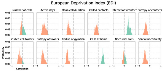 Distributions of the Spearman correlation coefficient for the relation between EDI and a selection of mobile phone indicators calculated for all 4914 city definitions. The histogram is colored green when correlation coefficients are positive and orange when negative.