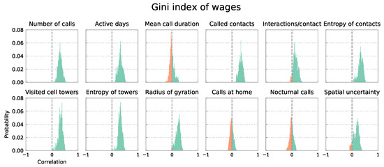 Distributions of the Spearman correlation coefficient for the relation between the Gini index and a selection of mobile phone indicators calculated for all 4914 city definitions. The histogram is coloured green when correlation coefficients are positive and orange when negative.