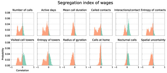 Distributions of the Spearman correlation coefficient for the relation between the Segregation index and a selection of mobile phone indicators calculated for all 4914 city definitions. The histogram is colored green when correlation coefficients are positive and orange when negative.