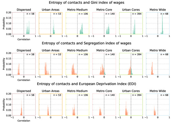 The case of the correlation between the entropy of contacts and the wage segregation shows variation between the MetroCore and UrbanCore classes compared to the other classes as their histogram shows both positive and negative relations, whereas these correlation are always negative for other classes, and all very strongly in the case of the Dispersed and Metrowide classes. This can probably be explained by the strong impact of urban delineation on the measurement of segregation. The results for compact definitions (MetroCore and UrbanCores) tend to diverge from extensive definitions (Dispersed and Metrowide).