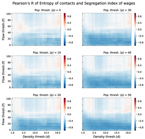 Heatmap of the Pearsons’s R for the relation between the entropy of contacts and the segregation index of wages for all city definitions represented in their according parameter-space. Each square on the heatmaps represents one of the 4914 city definitions projected in the space of definition criteria (x = density threshold, y = flow threshold, z = population threshold). It is coloured according to the value of the correlation index between the variable for the given definition. Density thresholds (d) are for the city centers and in thousands inhabitants/hectare, flow thresholds (f) are in percentage of population commuting to the city center, and population thresholds (p) are in thousands inhabitants in the wider city. As can be deduced, the top row plots have a population threshold (p) of 0.