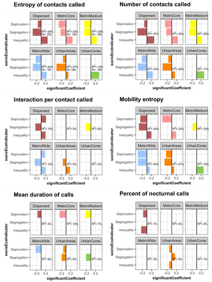 It is interesting to note that the intensity of the coefficients of the multiple regression vary slightly between the different clusters of city definitions but the overall picture is the same, except in the urban core clusters (the one composed of very dense city cores with little or no commuting periphery). Using these types of definition, the only significant variables at play is the level of inequality, which covariates positively with the entropy and number of contacts called. The absence of effect of deprivation and segregation in French dense city cores could indicate that the centrality and density of the residence has a positive effect on the size and diversity of the social network which is reflected in the phone behaviour observed. More generally, the predictive power of regressions () is always the weakest for urban cores, whereas it peaks for definitions of clusters as metropolitan areas and dispersed areas. This suggests that activity behaviours of the inner parts of metropolises (urban cores), as sensed by mobile phones throughout the day, cannot be well described by any of their static socioeconomic properties.