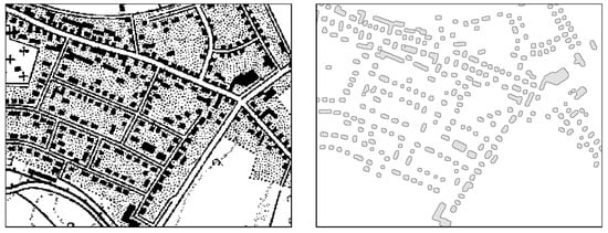 The raster data sets contain the required map information in implicit form. That is, in order to make use of the historical information such as building footprints, the data need to be transformed. The transformation is achieved by employing a region-oriented segmentation approach. Region-oriented segmentation is defined as the spatial partitioning of an image into sets of regions that meet a defined homogeneity criterion. For the data set at hand, we used the object morphologies as homogeneity criteria. To address the shape (and size) of the image objects, methods of mathematical morphology are applied. The basic morphological operators which are used in this work can be conceptualized as non-linear image filters []. The most important filters are, according to [], opening and closing, which are sequences of the basic operators erosion and dilation. In order to separate compact objects (building footprints) from linear and less compact objects (such as street lines), we employed a sequence of these morphological operations with the following parameters: a circle and an opening radius of 3 pixels (3.75 m in nature) are used as a structuring element (SE). The size of the SE depends on the resolution and needs to be adjusted according to the map image resolution (here 508 dpi). The SE depends further on the quality of the map scan and the segmentation process. Hence, the size of the SE cannot be determined solely deductively. The optimal SE size needs to be empirically adapted for other map scales, resolutions and scan qualities. In a second step, all other information with similar morphological characteristics as buildings, such as certain letters or map symbols, need to be detected and removed from the building data by means of an appropriate pattern recognition algorithm, which should be designed to be adaptable to the map layout. An adaptable pattern recognition approach for the maps at a scale of 1:25,000 used herein is described in Meinel et al. []. Subsequently, the built-up area from the current land use data set is used to mask the settlement area as a region-of-interest (ROI). The result is the extracted building layer (Figure 2). This procedure reduces both the computational load and the misclassification of non-building objects (false positives). A detailed and more generalized description of this complete auxiliary process of building footprint retrieval from maps can be found in References [,].