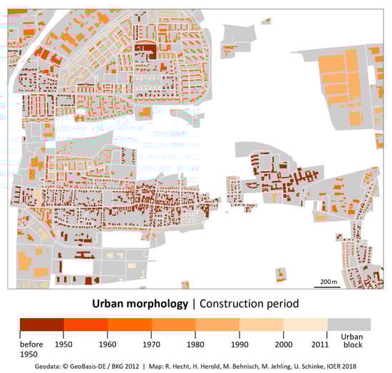 Further sources of error result from the quality of the topographic maps. In our approach, the building age is estimated at the block level because the positional accuracy of the extracted buildings is not sufficient for change detection at building level. Hence, demolition and infill development processes within an urban block have not been considered yet. To achieve this, a more enhanced building matching approach should be implemented [].
