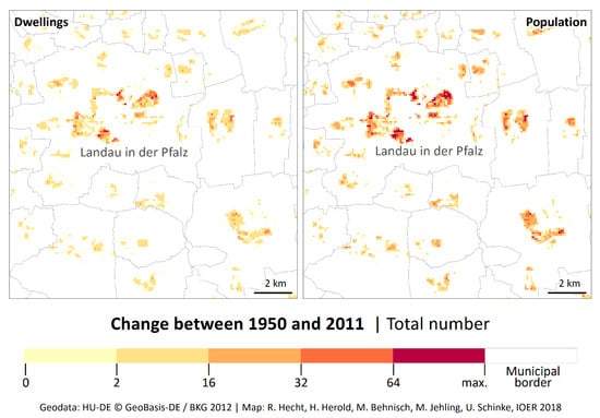 First, we take a look at the derived quantities of population and dwellings for the test bed “Landau.” A growth in the map series is clearly visible (see Figure 6 and Figure A2 in the Appendix A). If one considers the differences between 1950 and 2011, it becomes clear that settlement expansions took place over the entire area under investigation. However, it is also visible that settlement with higher densities took place around the City of Landau (see Figure 7). The effect of considering the urban morphology (through different types of residential buildings) in the process of calculating the population is particularly noticeable here.