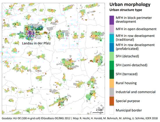 In our approach, we have decided to use official spatial data from NMCAs for the following reasons. NMCAs offer nationwide well-structured spatial vector data where relevant objects such as buildings, roads and land use information are explicitly modelled. In remote sensing data, these objects are depicted implicitly (in different data scenes with varying acquisition conditions) and additional resources for image interpretation are necessary to extract the relevant objects and structure them explicitly in a database. A further disadvantage of remote sensing data is significantly higher data costs particularly for large areas under investigation. OpenStreetMap is a good option for cities but data quality is currently not sufficient for analysing the urban morphology for larger regions due to incomplete building footprints in rural areas [].
