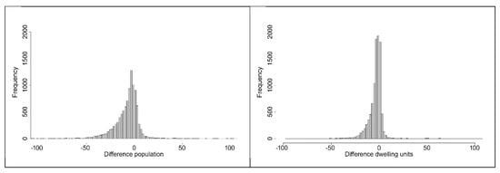 Histogram of the absolute error for population and dwelling units in the year 2011. The error is measured as the difference between estimated values and reference values.
