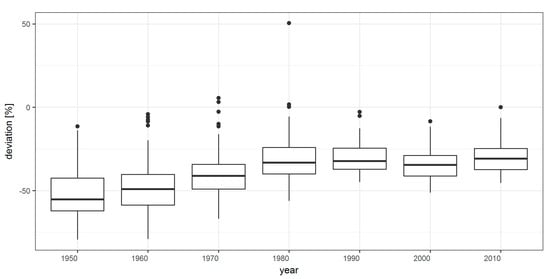 The results are also validated with regard to population dynamics from 1950 onwards. The official statistics provide reference values at the municipal level. Due to changes in administrative boundaries, the statistics were aggregated manually to match current municipal extents. Based on this timeline, the estimated dynamics from 1950 to 2010 are validated. Table 4 indicates the validation statistics for the study areas. The relative median and mean error increase from later to earlier time steps. The standard deviation is characterized by low values which, however, become higher the older the observed time is. This also applies to the inter-quartile range (IQR). Figure 9 highlights the validation results for the years and gives a more detailed view of the deviation regarding outliers.