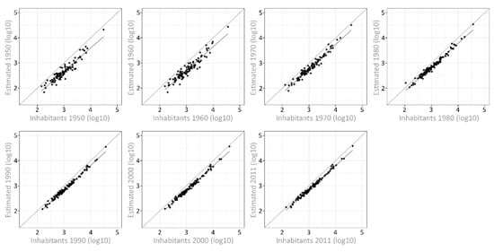 In order to assess the mean and median relative errors in older time steps, a further validation is required. Figure 10 addresses the validation of the results through the comparison of the logarithms of the absolute estimated and reference numbers of inhabitants. The results underline once again the observed underestimation of the population at the community level. It is also shown that the error increases with the size of the municipality. The increase of deviation towards older time steps also becomes visible in the absolute error.