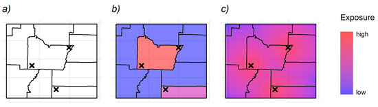 Boundary effects are an additional spatial phenomenon that occurs when high level spatial entities (e.g., spatially discrete emission sources) are aggregated within lower-level spatial units (e.g., census tracts). These might lead to incorrect attribution of environmental exposures to the local population and hence to variation in evidence of environmental health effects [35]. This phenomenon is depicted in Figure 1. Figure 1a) shows administrative areas with three emission sources. Figure 1b) depicts the simple aggregation of burdens as “unit-hazard coincidence”, implicitly affecting only the population within the corresponding administrative area. This approach suggests no exposure to populations close to the emitters which do not live in the host unit. Hence, the exposure might be under-represented by this approach. A review by Brender et al. [196] showed that in environmental studies, such assignments to lower-level spatial entities are used fairly often. The authors also point out that larger spatial entities tend to show a higher environmental bias resulting in ecological fallacy. On the contrary, distance-based methods like the one depicted in Figure 1c) decrease these effects by using spatial weighting of individual emission sources. However, while this only depicts a theoretical case, additional information about topographic or climatic characteristics of the area are required in order to describe the exposure risk in high spatial accuracy.