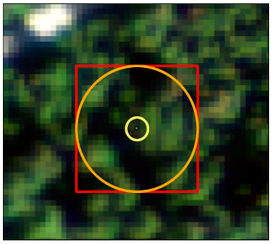 Composition and structure of common stand exam plot design, with outer circle (orange) representing a 0.04 hectare plot for trees greater than or equal to 12.7 cm diameter at breast height (radius = 11.4 m) and inner circle (yellow) representing a 0.0013 ha plot for trees less than 12.7 cm DBH (radius = 2 m). The outer square represents the area summarized for the NAIP imagery and LiDAR data.