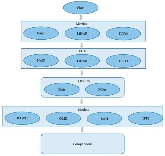Flow diagram of the data sources, processing steps, modeling, and comparisons made within the study. NAIP, LiDAR, and TOPO data were converted to texture, height, and elevation metrics and transformed to spatial surfaces using principal component analysis (PCA). PCA surface values were then related to field data based on plot locations (Overlay) and were used to model basal area weighted diameter (BAWD), quadratic mean diameter (QMD), basal area per hectare (BAH) and trees per hectare (TPH) relationships. Modeled relationships were then used to create raster surfaces that were compared at the spatial resolution of the plot and stand.