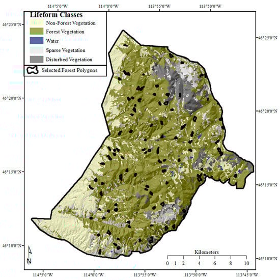 Daly-Gold Study Area lifeform classification with randomly selected forest polygons highlighted in black. Summarized metric predictions were compared in these polygons.