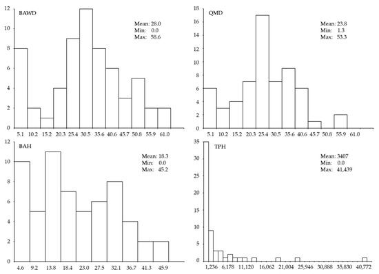 Distribution of basal area weighted diameter (BAWD), quadratic mean diameter (QMD), basal area per hectare (BAH), and trees per hectare (TPH) collected on 60 plots within the study area.