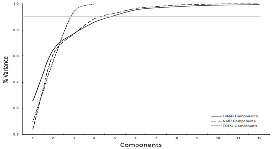 Principal component graph, where LiDAR is solid black, NAIP is dashed, and TOPO is dotted. The solid horizontal line indicates the minimum 95% threshold of the cumulative variation that is explained by the number of principal components.