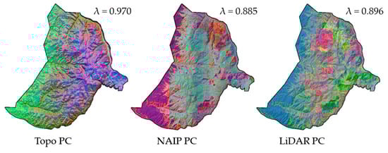Illustration of TOPO, NAIP, and LiDAR principal component raster datasets. Note that only the first three components are displayed by the red-green-blue-color composite. The proportion of correlation explained (λ) by those components is display above each raster dataset.