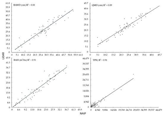 Linear relationship between basal area weighted diameter (BAWD), quadratic mean diameter (QMD), basal area per hectare (BAH), and trees per hectare (TPH) estimates derived from NAIP and LiDAR models (Table 1). Observed versus predicted values for NAIP and LiDAR based BAWD, QMD, BAH, and TPH are given in Figure A2.