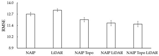 Given that NAIP and NED products are readily available across broad spatial extents and free to the public, these data represent low cost potential predictor variables for modeling forest characteristics within the continental USA. Adding additional remotely sensed data, especially at an increased cost, is really only justifiable from a practical standpoint when the quality (less error) of models are substantially improved. It follows then that acquiring airborne LiDAR for the sole purpose of estimating forest characteristics within the continental USA is really only justifiable when the quality of model predictions substantially improve, and that the added expense of acquisition is less than the gains associated with improved model prediction. Similarly, in the event that this situation is reversed (airborne LiDAR data freely available and there is an additional cost to acquire imagery) the same line of reasoning would apply. However, the improvement in predictive model quality of forest characteristics such as BAWD, QMD, BAH, and TPH given different sources of remotely sensed data is seldom tested. While these different sources of data have been successfully related to forest metrics and measure different aspects of the forest (spectral, elevation, and height) it is important to recognize they are only correlated with BAWD, QMD, BAH, and TPH, and are more than likely highly correlated with one another for a given geographic area. Moreover, given the similarity in reported model errors in studies that solely use imagery [6,7,8,9] or LiDAR [3,4] based predictor variables to estimate forest characteristics, it may be that both sources of data provide similar predictive capability.