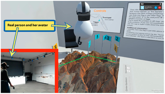 Immersive virtual reality is also significantly employed as an educational tool in many areas. We can find its educational application in domains such as engineering [32,33], biology [34,35], foreign languages [36], geometry [37], emergency management [38], physics [39], design [40], geography and earth sciences in general [41,42,43,44,45], and in other more singular domains such as martial arts [46] and communication skills training for individuals with autism [47]. Virtual environments including VR have a long tradition in geographical research and education [48,49,50,51], but until recently, user experiences have only been rarely reported. Several recent studies analyzed the potential benefits of immersive technologies for education in geography and task solving. Philips et al. [52] examined the usage of immersive 3D geovisualization and its usefulness in a research-based learning module (flood risk assessment). The findings of a qualitative student survey showed a range of benefits (improved orientation in the study area, higher interactivity with the data, and enhanced motivation through immersive 3D geovisualization) and suggested that an immersive 3D visualization can increase learning effectiveness in higher education. Focusing specifically on hypsography education using modern technology, Carrera et al. [53] studied the possibilities of Augmented Reality technology (AR). They experimented with 63 students and tested the usability of AR to interpret relief (maximum slope, visibility between points, contour interval, and altitude interpretation). Usability was further assessed in terms of efficiency (time to accomplish the task), effectiveness (number of mistakes) and motivation (subjective satisfaction). The results of the study confirmed the enhanced usability of an AR environment for specific tasks dealing with questions of interpreting relief. None of the aforementioned studies combined both VR and a collaborative environment.