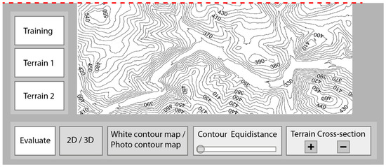 The default visualization in both tasks is a 2D map. If the user cannot solve the task correctly on a 2D map, they can use various educational tools to help examine and manipulate the map. The application provides a virtual control panel (Figure 2) next to the map in the CIVE. One of the main advantages is the possibility to switch the map from 2D to 3D at any time. The map can also be switched between a white contour map and an orthophoto contour map. Contour line equidistance can be customized using a slider. Finally, when the user wants to verify their solution, they can use the Evaluate button.