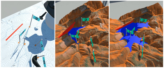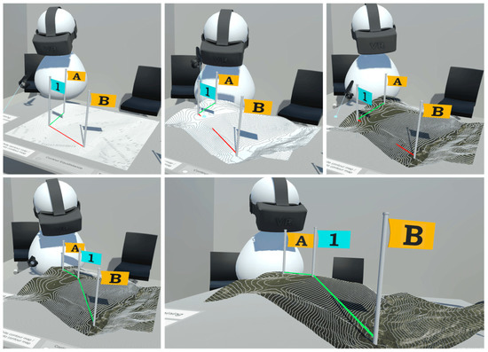 For purposes of this research, two tasks were designed: Task 1—Mirror Signals and Task 2—Flooded Valley. In case of the Mirror Signals task, a map was presented to participants, with two fixed flags marking the start point (flag A) and the end point (flag B). Next to the map were five more available flags numbered 1, 2, 3, 4, and 5, which could be picked up and placed onto the map (see Figure 3). The task was to connect start point A with end point B using these additional flags in a way that mirror signals (or fire signals) could be transmitted between neighboring flags only with direct visibility. This means that the view to flag 1 from flag A, flag 2 from flag 1, and so on had to be unobstructed until an unobstructed view to flag B was obtained. The goal was to use the least number of flags possible to link the start point with the end point (see Supplement for Video S1). In the first task, the 3D model of the terrain can be dissected into individual layers and a cross-section of the terrain can be viewed.