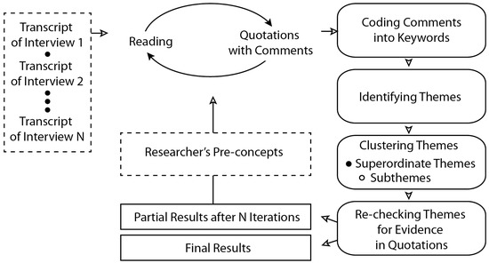We employed specific idiographic case study data analysis in the IPA and the variation for multiple cases (respectively, multiple participants) as described in Smith et al. [78,81,82]. This analysis focused mainly on the shared experience (common characteristics of experience) of participants, but also mentioned significant and distinct experiences [77]. An analysis is slowly built-up by reading individual cases and creating statements about the whole group of participants. The analytic process is cyclic (iterative). The themes are reconsidered and rebuilt many times [78]. The results are transparent because they are evidenced by data examples (quotations). The results are structured according to theme. As shown in Figure 7, the analytic process cycle is as follows.