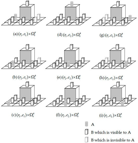 In this way, we can transform the 3-D space into 0-D 9 units (center points), in order to convert a 6-D space into nine 3-D subspaces: , , , (Figure 4). Each subspace can be expressed in three dimensions and can be used to visually analyze whether an encounter event between two individuals is possible. For example, in sample space , A can see B on , , , , , and , while others are not visible.