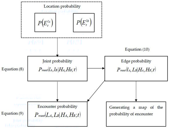 where records the probability for individual A at position lA at time t, and records the probability for B at position lB at time t. The can be calculated for all of the positions in a map at any time, and is a joint probability of and . The flowchart for a step-by-step probability calculation is shown in Figure 5.