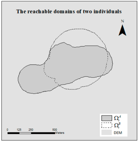 The motion of two objects is assumed to be independent of each other, and moving objects usually have a certain directional preference for the destination. Some scenarios that are consistent with the hypothesis of this experiment can be like this, such as human movement, including the potential movements of missing persons and recreationalists [36]. Classical time geography [21] can calculate the reachable domain of an individual at a given moment in time based on the spatio-temporal information of the starting and ending points and the maximum speed of the individual. Such reachable domains are collections of discrete units in DEM. Given the reachable domains of two individuals A and B in the DEM at time t: = {lA[1], lA[2], …}, and = {lB[1], lB[2], …}, where lα indicates the center point of the unit where the individual α is located, and represents the set of potential units (labeled as lα) of individual α at time t (Figure 7). and contain 365 and 360 cells, respectively.
