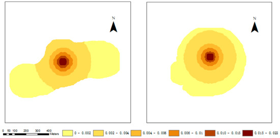 In order to compare the influence of obstacles on the encounter, here we calculated the encounter probability between individuals A and B without considering the obstacle factor according to Equations (14) and (15). In the case of ignoring obstacles, Equation (14) calculates the probability of encounter as 0.055, which is significantly larger than the encounter probability of 0.036 in obstacle scenarios; Equation (15) can be used to generate the probability map of A meeting B (Figure 11a) and that of B meeting A (Figure 11b). Compared with Figure 10 and Figure 11, there is a significant distinction in probability distribution and density, which fully reflects the influence of obstacles on the encounter event.