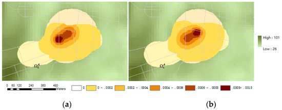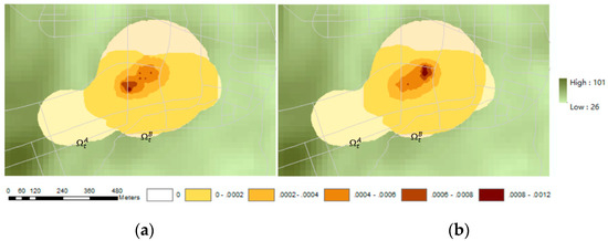 The probabilistic attributes of each location point lA in are mapped to the DEM, resulting in a probability map of A encountering B in the obstacle space (Figure 10a). Similarly, we can also get a probability map of B encountering A (Figure 10b). The green base map is the DEM data with the road line and the potential location areas of the individuals A and B. The darker the color, the higher the value. As can be seen from the figure, the encounter probabilities of moving objects A and B are respectively larger in the center of each reachable range and . This result is related to the method of generating the positional probability of an individual by the inverse distance weighting method; however, it does not affect the validity of the model presented. It is worth mentioning that differences in the visual distance (the farthest distance can be seen), reachable domain, and probability distribution between individuals results in the differences in the encounter probability maps to a certain extent; that is, the probability map of A meeting B is different from that of B meeting A [17].