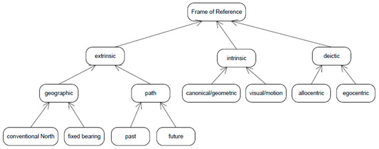 In Figure 3, we show a categorization of frames of reference as proposed in [21]. Hereafter we restrict the description to three of them for space limitation: the extrinsic frame of reference of subtype ‘geographic—conventional North’ (abbreviated in the rest of the paper as the ‘geographic’ frame of reference), the intrinsic frame of reference of subtype ‘geometric’ (abbreviated in the rest of the paper as the ‘geometric’ frame of reference), and the deictic frame of reference of subtype ‘allocentric’ (abbreviated in the rest of the paper as the ‘deictic’ frame of reference). These three subtypes of frames of reference will be used throughout the paper as a recurrent case study. For an explanation of all frames of reference, we point to the original paper [21].