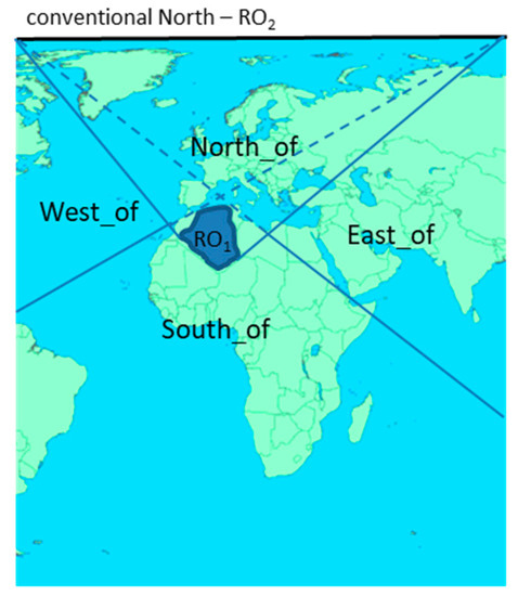 We can notice that by shortening or enlarging the conventional North line, the extent of the areas assigned to cardinal directions is modified accordingly. Also, based on the projection, the tangent lines to objects might not be straight. Therefore, the second reference object in the geographic frame of reference is an important parameter to be chosen. As an example of query, if the user is interested to find the countries that are south of Algeria, the corresponding SQL query would be: