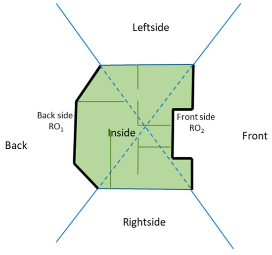 As a second subtype, we discuss now the geometric frame of reference. In this case, objects B and C of the 5-intersection model correspond to ‘back’ and ‘front’ sides of the reference object in Figure 5. In this frame of reference, the directional relations inside, rightside, back, leftside, and front are identified. They can be mapped to 5-intersection relations by the following transformation function for the intrinsic-geometric (IC) frame of reference :