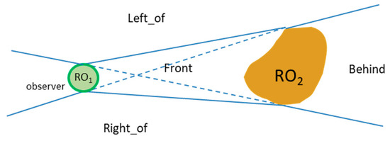 Directional relations represent a category of spatial relations that provide information about the spatial arrangement of objects in a scene or locations in an embedding space [13,14]. Directional relations are in most cases binary relations between two spatial objects, but a frame of reference is needed to disambiguate the meaning of the relation in a given context [15,16,17]. Frames of reference in connection with directional relations have been studied since long time from historical classifications [18,19,20] to recent developments [21,22,23].