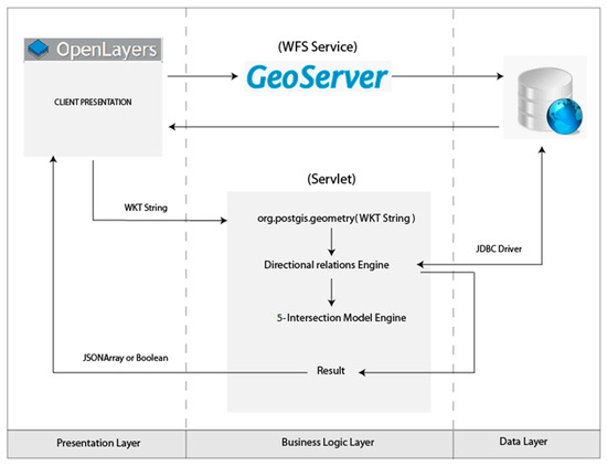 The presentation layer handles communications with entities external to the system. The layer includes all the components that deal with the presentation of information to the client, allowing a high-level interaction with the user. As a presentation layer, our implementation uses the framework Openlayers, which is a JavaScript library for displaying maps within a web browser, released under the 2-clause BSD license. OpenLayers allows the creation of real GIS applications in web. The presentation layer communicates with the business logic layer via a web service. There are many web services available in the OGC standard for exchanging geospatial information. We are particularly interested in vector data and, therefore, the web service to be used is the Web Feature Service (WFS) that allows the exchange of vector data in the OGC standard. Let us deepen how OpenLayers works: