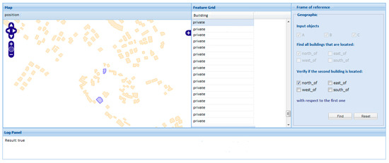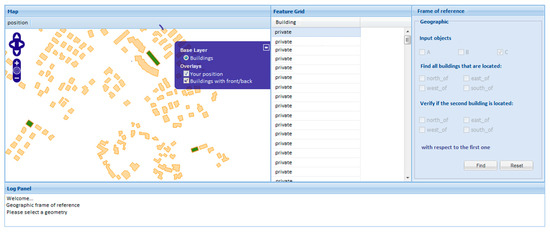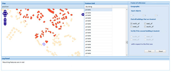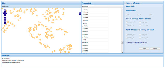 The main window of the application is shown in Figure 12. On the left side, a frame displays the geometric features of the building of a selected area. Within the frame, we find tools for navigating and zooming the map. In the central part, some descriptive attributes are shown, which identify the type of building (home, shop, school), where each attribute refers to a geometric component. In the right side, there is a form that manages the interaction with the user, where it is possible to specify the directional relation to be used in the query. At the bottom, there is the log panel.