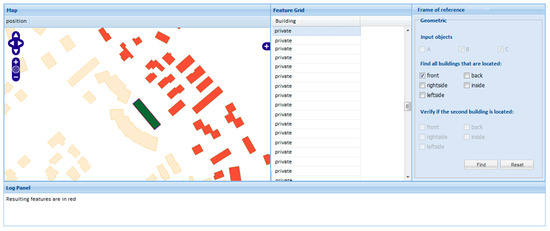 Such buildings are colored in green: clicking on one of them, the frame of reference will change to geometric. This action will also change the kind of directional relations that can be used with this frame of reference. Figure 16 shows the case in which all the buildings in front of the selected one are requested.