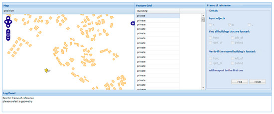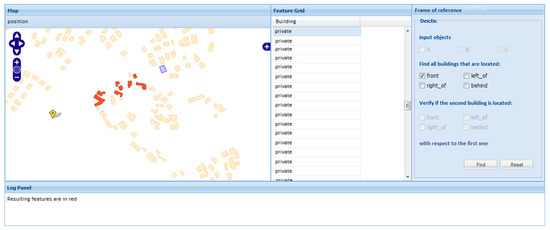 In this frame of reference, the user is given the possibility to set his/her own position. A specific button Location is used for this purpose; when user position is selected, the frame of reference will shift to deictic (Figure 17). As an example, let us assume that the user requires to select all the buildings that are between his/her position and a given building. The user needs to select the latter building, choose the relation front, and click on Find. In Figure 18, the result is shown.