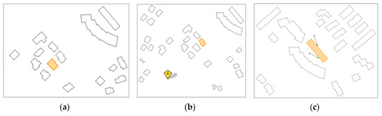Figure 19a shows the first map examined by participants to answer the first two questions. The map referred to the extrinsic frame of reference of geographic subtype and the questions were to color all the buildings that are north of the highlighted building and west of it, respectively. The third and fourth questions concerned the deictic frame of reference and were based on Figure 19b. In the first question, the user needed to color all the buildings placed between his/her position and the highlighted building. In the second question, the user was asked to color all the buildings located to the right of the highlighted building from the point of view of the user′s position. The fifth and sixth questions are related to the geometric intrinsic frame of reference. Figure 19c shows the scenario given to the users for tests. Participants were asked to color all the buildings in front of the highlighted building and, in the last question, to color all the buildings to the right of the highlighted building.