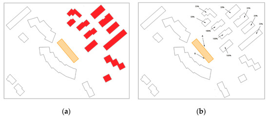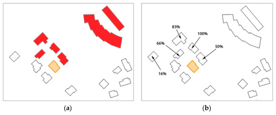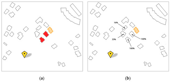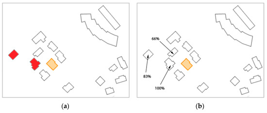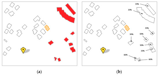 The user tests were evaluated by counting the number of colored buildings in each answer and assigning a percentage of users that selected each building. Then, we compared the user tests with the results coming out from running the application framework. For the geographic frame of reference, the results are shown in Figure 20. In Figure 20a, there is the result given by the application and, in Figure 20b, there is the result obtained from the user tests.