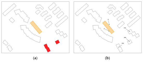 Results of the north_of relation with respect to the selected building: (a) from the application; (b) from the user tests.