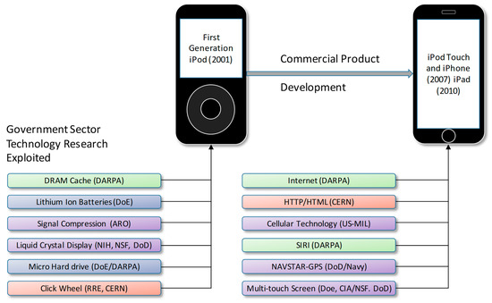 Mazzucuto (2011) [8] has argued that technology is to a large degree driven by government funded research, citing the example of the iPhone which exploits and relies upon over 20 government funded technologies (e.g., GPS, high-performance batteries, microprocessors, solid state memory, etc.). Figure 2 shows the amount of government funded research that went into the iPod/iPhone products delivered by Apple and considered commercially innovative.